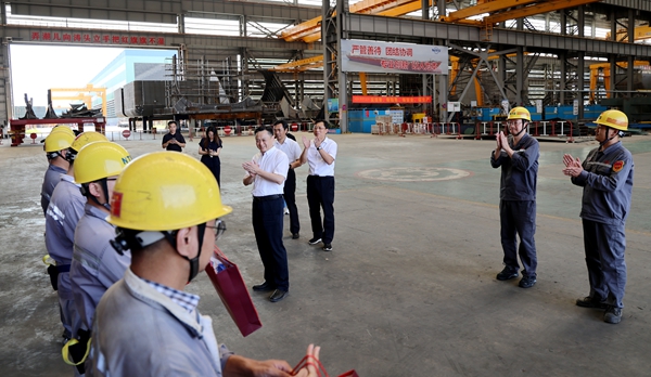 申強(qiáng)一行來(lái)到智能化分段車間,與現(xiàn)場(chǎng)員工親切交流,詢問(wèn)工作時(shí)間、防暑措施等情況,將防暑降溫用品送到一線員工手中,并叮囑大家注意健康防護(hù),注意勞逸結(jié)合,落實(shí)防暑降溫措施,為企業(yè)多做貢獻(xiàn)。