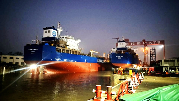 1月12日清晨,公司2#塢區(qū)域,參與下水工作的人員冒著凜冽寒風堅守在工作崗位上,用高漲的熱情有條不紊地進行著船舶下水前各項準備工作。6:30,下水工作啟動,30#31#50000噸Ⅱ類化學品船依次在拖輪的達到下,駛出船塢,?康酱棒秆b碼頭,大節(jié)點目標順利實現(xiàn)。