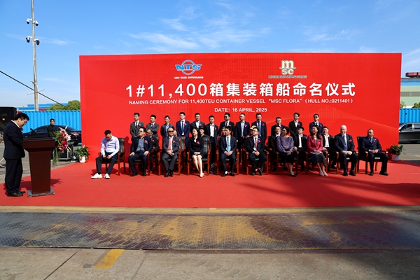 4月16日上午,公司舉行船舶命名儀式,1#11400箱、3#9#8100箱LNG雙燃料動(dòng)力集裝箱船被分別命名為“MSC FLORA”“MSC CAMEROON”“MSC NAMIBIA”號(hào)。