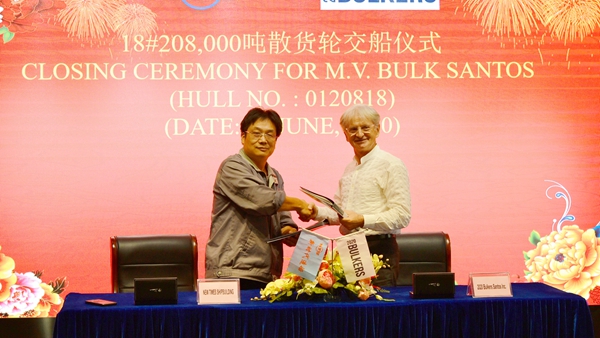 6月16日下午,18#208000噸散貨船的交船簽字儀式在新時代辦公樓八樓會議室舉行,常務(wù)副總經(jīng)理張玉永與2020 Bulkers公司代表Davor Radic先生一起出席儀式,共同簽署交船文本。