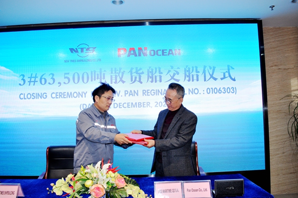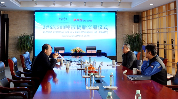 2020年即將過去,又一艘船舶完工交付,這是企業(yè)年度交付的第27艘船舶,年度累計(jì)交付船舶442.07萬載重噸。12月22日上午,公司在八樓會(huì)議室為3#63500噸散貨船舉行交船簽字儀式,公司總經(jīng)理劉海金、常務(wù)副總經(jīng)理張玉永與韓國船東Pan Ocean Co., Ltd.代表一起出席活動(dòng),簽署交船文本,共同見證該船正式交付運(yùn)營。