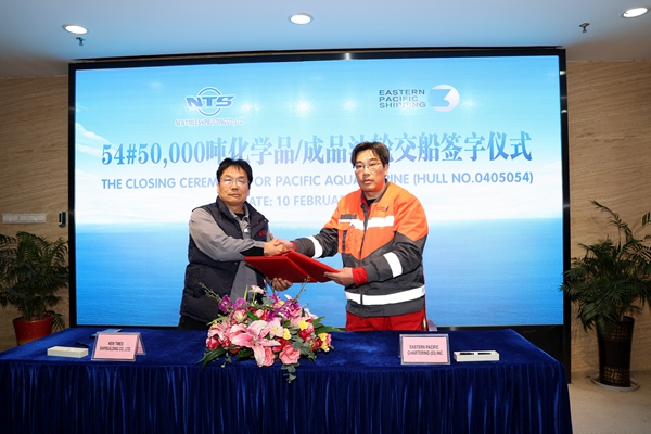 2月10日上午,54#50000噸Ⅱ類化學(xué)品船簽字交付儀式在辦公樓八樓會議室舉行,總經(jīng)理劉海金、常務(wù)副總經(jīng)理張玉永與新加坡船東EPS代表倪杰等嘉賓出席活動。