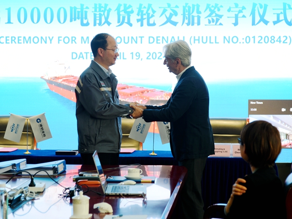 4月19日下午,公司舉行船舶簽字交付儀式,42#210000噸雙燃料動(dòng)力散貨船完工交付船東喜馬拉雅航運(yùn)公司運(yùn)營(yíng)?偨(jīng)理劉海金、常務(wù)副總經(jīng)理張玉永與船東喜馬拉雅航運(yùn)公司代表Davor Radic出席活動(dòng),見(jiàn)證船舶交付。