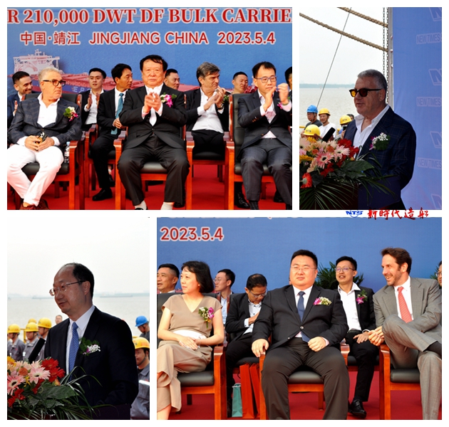 5月4日上午,32#210000噸雙燃料動(dòng)力散貨船命名儀式在公司3#碼頭隆重舉行。董事長袁凱飛、總經(jīng)理劉海金、常務(wù)副總經(jīng)理張玉永、副總經(jīng)理袁衡、總經(jīng)理助理徐震宇與船東EPS(Eastern Pacific Shipping Pte. Ltd.)董事長Idan Ofer、教母Wong Liang Pin等嘉賓出席儀式。