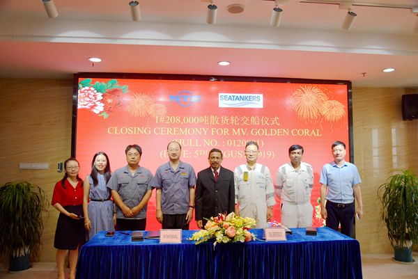 8月5日,公司舉行簽字交船儀式,總經(jīng)理劉海金、常務(wù)副總經(jīng)理張玉永與船東Frontline公司 Mr.A.C. Caeiro一起出席,1#208000噸散貨船順利交付船東。