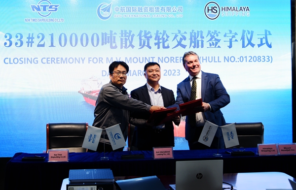 常務(wù)副總經(jīng)理張玉永與船東Himalaya公司代表Jan Andersson、中航租賃航運(yùn)子公司副總經(jīng)理朱佳峰共同簽署交付文本,總經(jīng)理劉海金、副總經(jīng)理袁衡、船東技術(shù)總監(jiān)Olav Eikrem、現(xiàn)場經(jīng)理Davor Radic、中航租賃航運(yùn)子公司資產(chǎn)經(jīng)營部副總經(jīng)理秦珩、中航租賃航運(yùn)子公司資產(chǎn)經(jīng)營部副總監(jiān)阮曉東、中航租賃航運(yùn)子公司航運(yùn)歐美市場部副總經(jīng)理陳崢嶸等嘉賓出席活動,見證船舶成功交付。