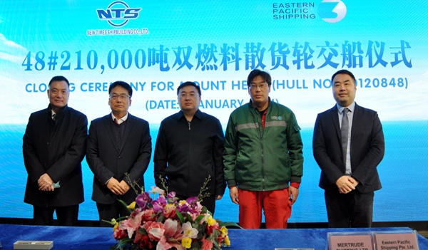 1月5日上午8:58,公司在辦公樓八樓會(huì)議室舉行船舶簽字交付儀式,總經(jīng)理劉海金、常務(wù)副總經(jīng)理張玉永、副總經(jīng)理袁衡與新加坡船東EPS公司代表倪杰出席活動(dòng),張玉永與倪杰代表雙方在交船文本上簽字,48#210000噸雙燃料動(dòng)力散貨船交付船東運(yùn)營。船東Eastern Pacific Shipping Pte. Ltd.(EPS),目前在我們企業(yè)訂有4艘110000噸油船和11艘210000噸雙燃料動(dòng)力散貨船、7艘7000箱集裝箱船、6艘50000噸化學(xué)品船和2艘155500噸雙燃料動(dòng)力油船,此次交船的是210000噸雙燃料動(dòng)力散貨船列船中的第9艘船舶。