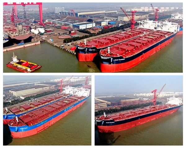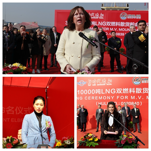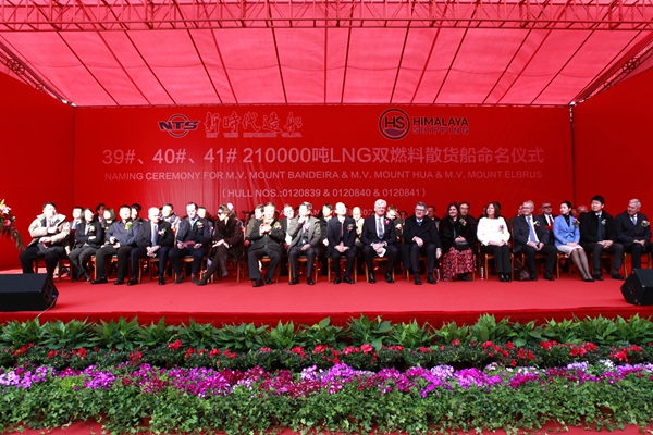 教母Berit Hauge、Cristina Villarreal Fraile、Mina Iizawa分別將39#、40#、41#210000噸LNG雙燃料散貨船命名為“Mount Bandeira”號(hào)、“Mount Hua”號(hào)和“Mount Elbrus”號(hào),并祝愿新船一帆風(fēng)順。