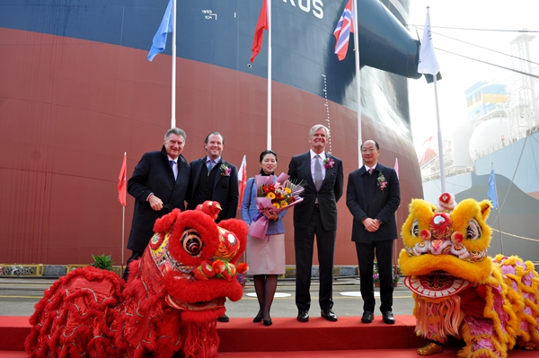 1月5日上午10:30,39#40#41#210000噸雙燃料動(dòng)力散貨船命名儀式在碼頭隆重舉行。
