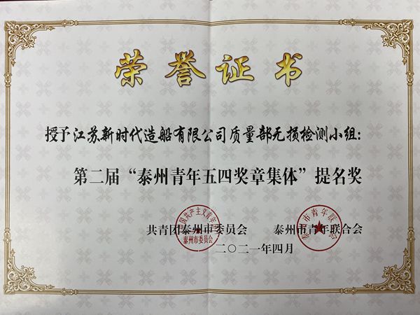 用奮斗點(diǎn)亮青春:質(zhì)量部無損檢測小組榮獲“泰州青年五四獎(jiǎng)?wù)录w”提名獎(jiǎng)(圖)